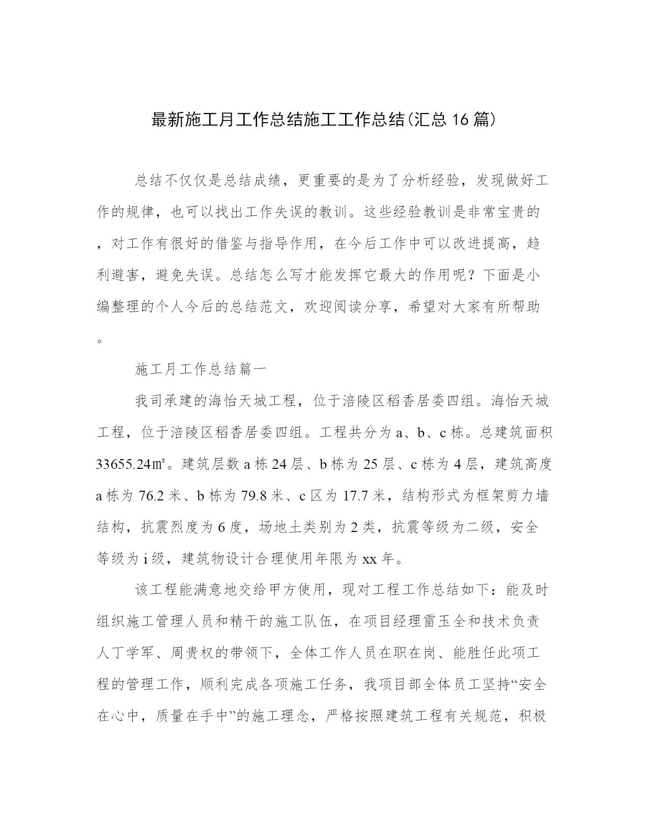 最新施工月工作总结施工工作总结(汇总16篇)总结不仅仅是总结成绩,更重要的是为了分析经验,发现做好工作的规律,也可以找出工作失误的教训。这些经验教训是非常宝贵的,对工作有很好的借鉴与指导作用,在今后工作中可以改进提高,趋利避害,避免失误。总结怎么写才能发挥它最大的作用呢?下面是小编整理的个人今后的总结范文,欢迎阅读分享,希望对大家有所帮助。施工月工作总结篇一我司承建的海怡天城工程,位于涪陵区稻香居委四组。海怡天城工程,位于涪陵区稻香居委四组。工程共分为a、b、c栋。总建筑面积33655.24㎡。建筑层数a