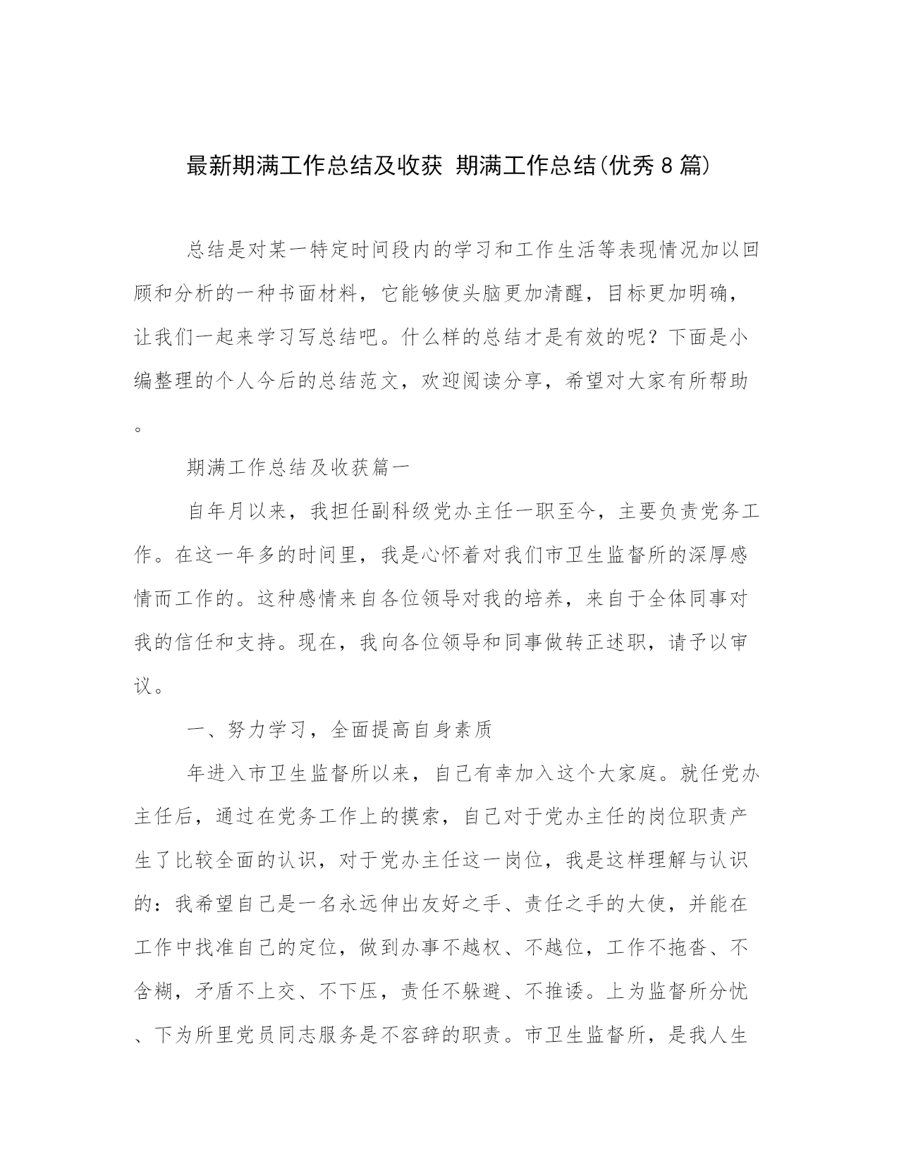 最新期满工作总结及收获期满工作总结(优秀8篇)总结是对某一特定时间段内的学习和工作生活等表现情况加以回顾和分析的一种书面材料,它能够使头脑更加清醒,目标更加明确,让我们一起来学习写总结吧。什么样的总结才是有效的呢?下面是小编整理的个人今后的总结范文,欢迎阅读分享,希望对大家有所帮助。期满工作总结及收获篇一自年月以来,我担任副科级党办主任一职至今,主要负责党务工作。在这一年多的时间里,我是心怀着对我们市卫生监督所的深厚感情而工作的。这种感情来自各位领导对我的培养,来自于全体同事对我的信任和支持。现在,我向各