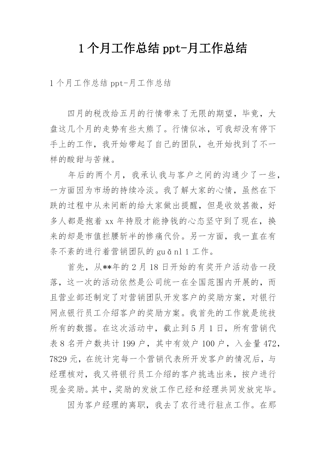 1个月工作总结ppt-月工作总结1个月工作总结ppt-月工作总结四月的税改给五月的行情带来了无限的期望,毕竟,大盘这几个月的走势有些太熊了。行情似冰,可我却没有停下手上的工作,我开始带起了自己的团队,也开始找到了不一样的酸甜与苦辣。年后的两个月,我承认我与客户之间的沟通少了一些,一方面因为市场的持续冷淡。我了解大家的心情,虽然在下跌的过程中从未间断的给大家做出提醒,但是收效甚微,好多人都是抱着xx年持股才能挣钱的心态坚守到了现在,换来的却是市值拦腰斩半的惨痛代价。另一方面,我一直在有条不紊的进行着营销团队