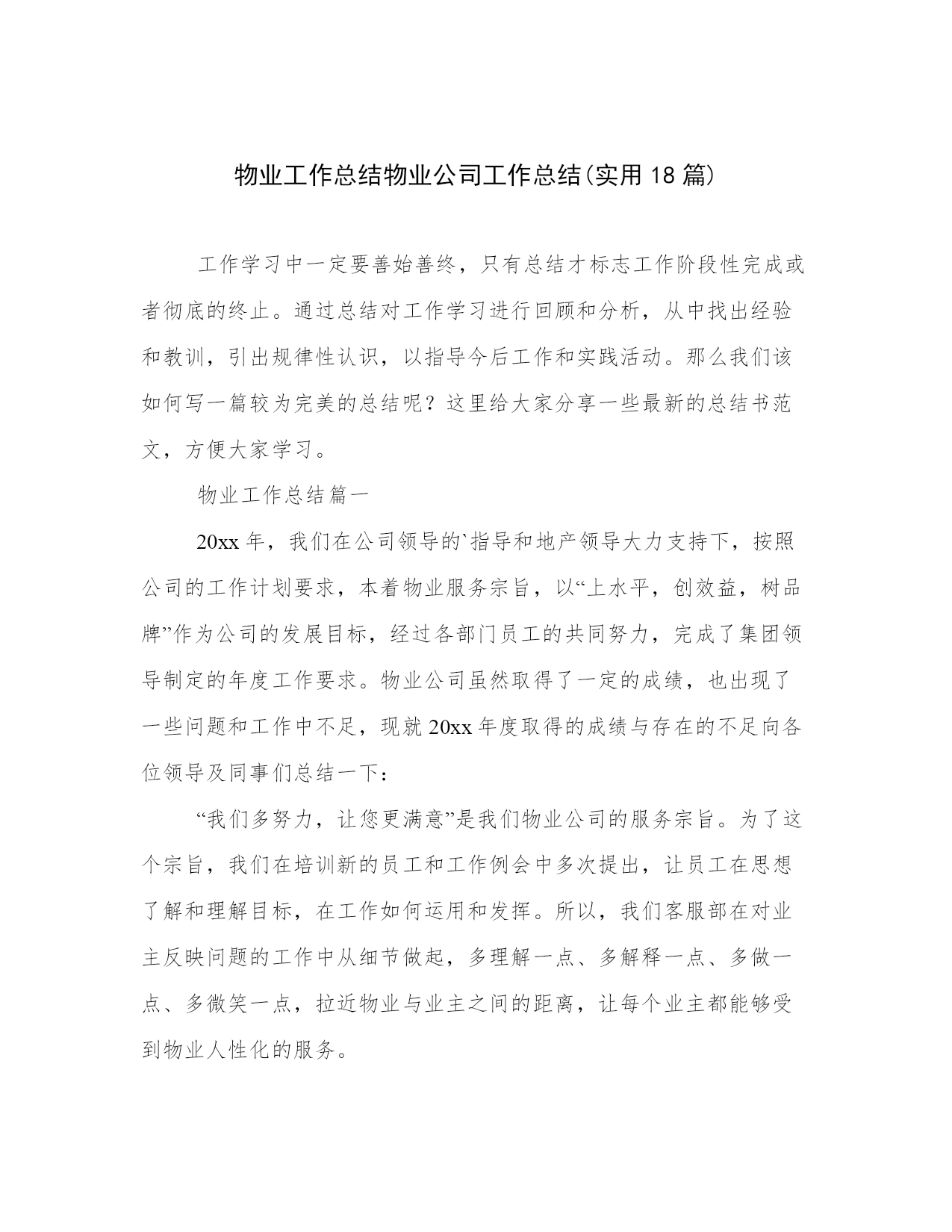 物业工作总结物业公司工作总结(实用18篇)工作学习中一定要善始善终,只有总结才标志工作阶段性完成或者彻底的终止。通过总结对工作学习进行回顾和分析,从中找出经验和教训,引出规律性认识,以指导今后工作和实践活动。那么我们该如何写一篇较为完美的总结呢?这里给大家分享一些最新的总结书范文,方便大家学习。物业工作总结篇一20xx年,我们在公司领导的`指导和地产领导大力支持下,按照公司的工作计划要求,本着物业服务宗旨,以“上水平,创效益,树品牌”作为公司的发展目标,经过各部门员工的共同努力,完成了集团领导制定的年度工