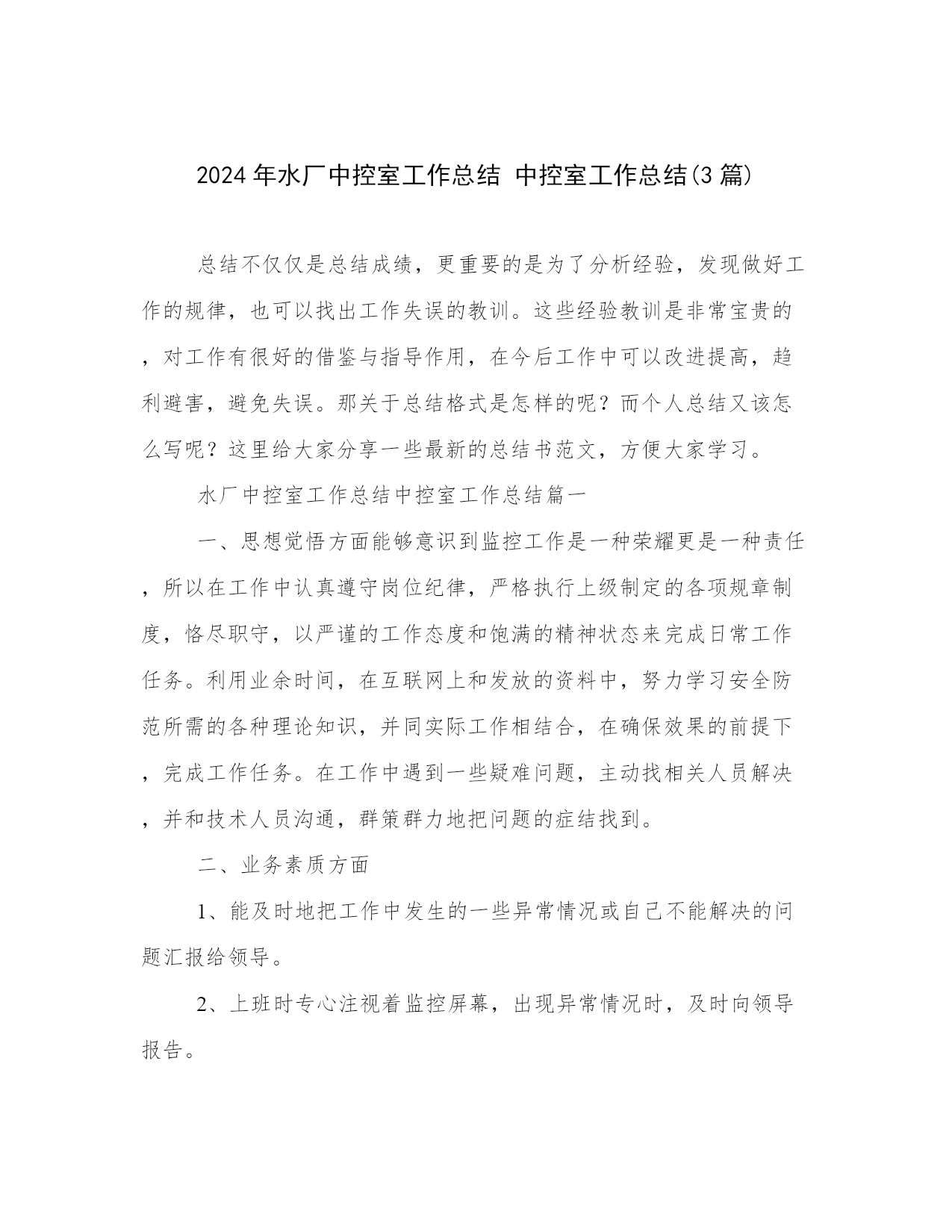 2024年水厂中控室工作总结 中控室工作总结(3篇).docx