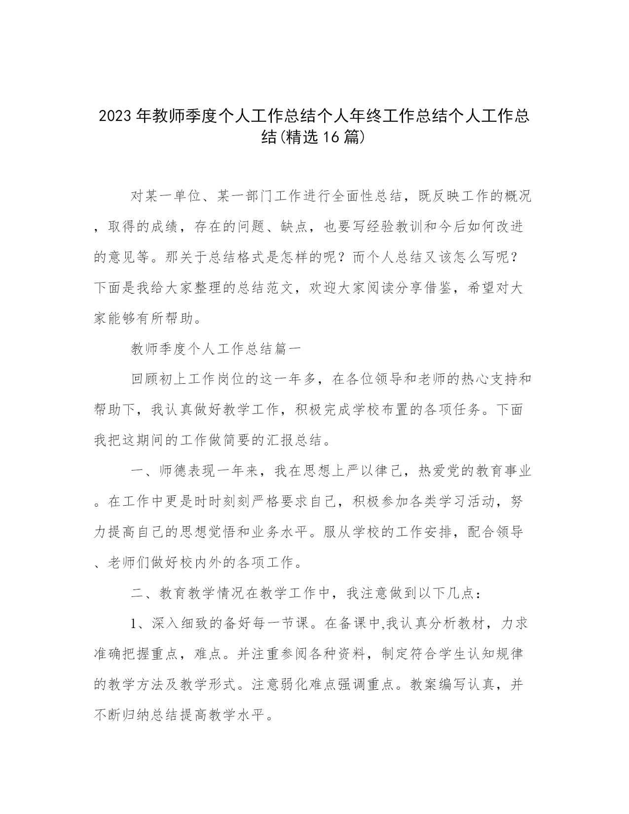 2023年教师季度个人工作总结个人年终工作总结个人工作总结(精选16篇).docx