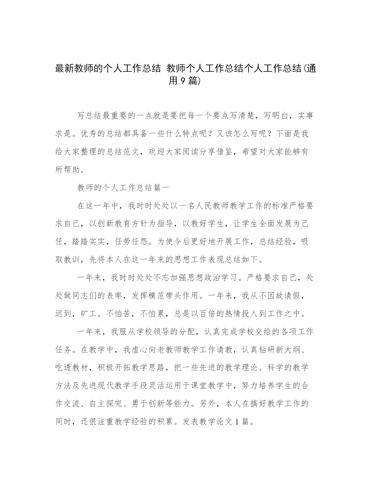 最新教师的个人工作总结教师个人工作总结个人工作总结(通用9篇)写总结最重要的一点就是要把每一个要点写清楚,写明白,实事求是。优秀的总结都具备一些什么特点呢?又该怎么写呢?下面是我给大家整理的总结范文,欢迎大家阅读分享借鉴,希望对大家能够有所帮助。教师的个人工作总结篇一在这一年中,我时时处处以一名人民教师教学工作的标准严格要求自己,以创新教育方针为指导,以教好学生,让学生全面发展为己任,踏踏实实,任劳任怨。为使今后更好地开展工作,总结经验,吸取教训,先将本人在这一年来的思想工作表现总结如下。一年来,我时时处