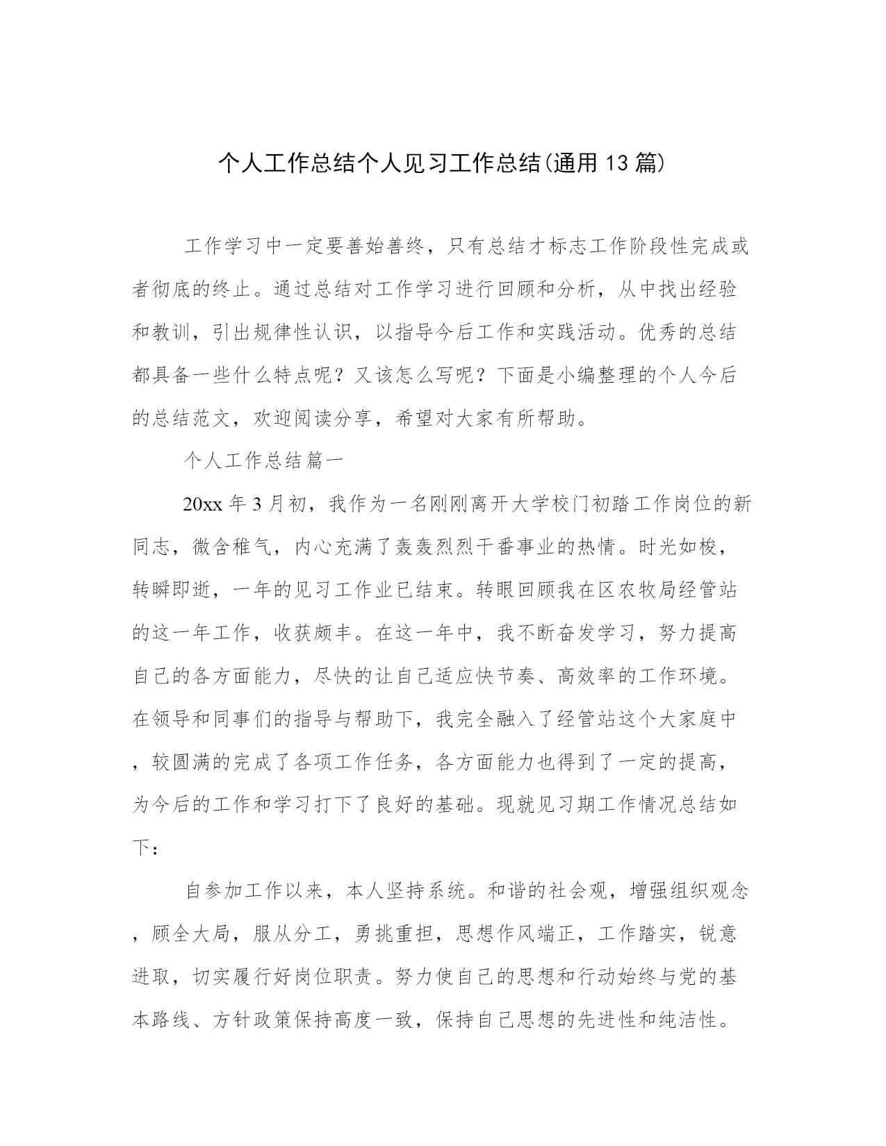 个人工作总结个人见习工作总结(通用13篇)工作学习中一定要善始善终,只有总结才标志工作阶段性完成或者彻底的终止。通过总结对工作学习进行回顾和分析,从中找出经验和教训,引出规律性认识,以指导今后工作和实践活动。优秀的总结都具备一些什么特点呢?又该怎么写呢?下面是小编整理的个人今后的总结范文,欢迎阅读分享,希望对大家有所帮助。个人工作总结篇一20xx年3月初,我作为一名刚刚离开大学校门初踏工作岗位的新同志,微含稚气,内心充满了轰轰烈烈干番事业的热情。时光如梭,转瞬即逝,一年的见习工作业已结束。转眼回顾我在区农