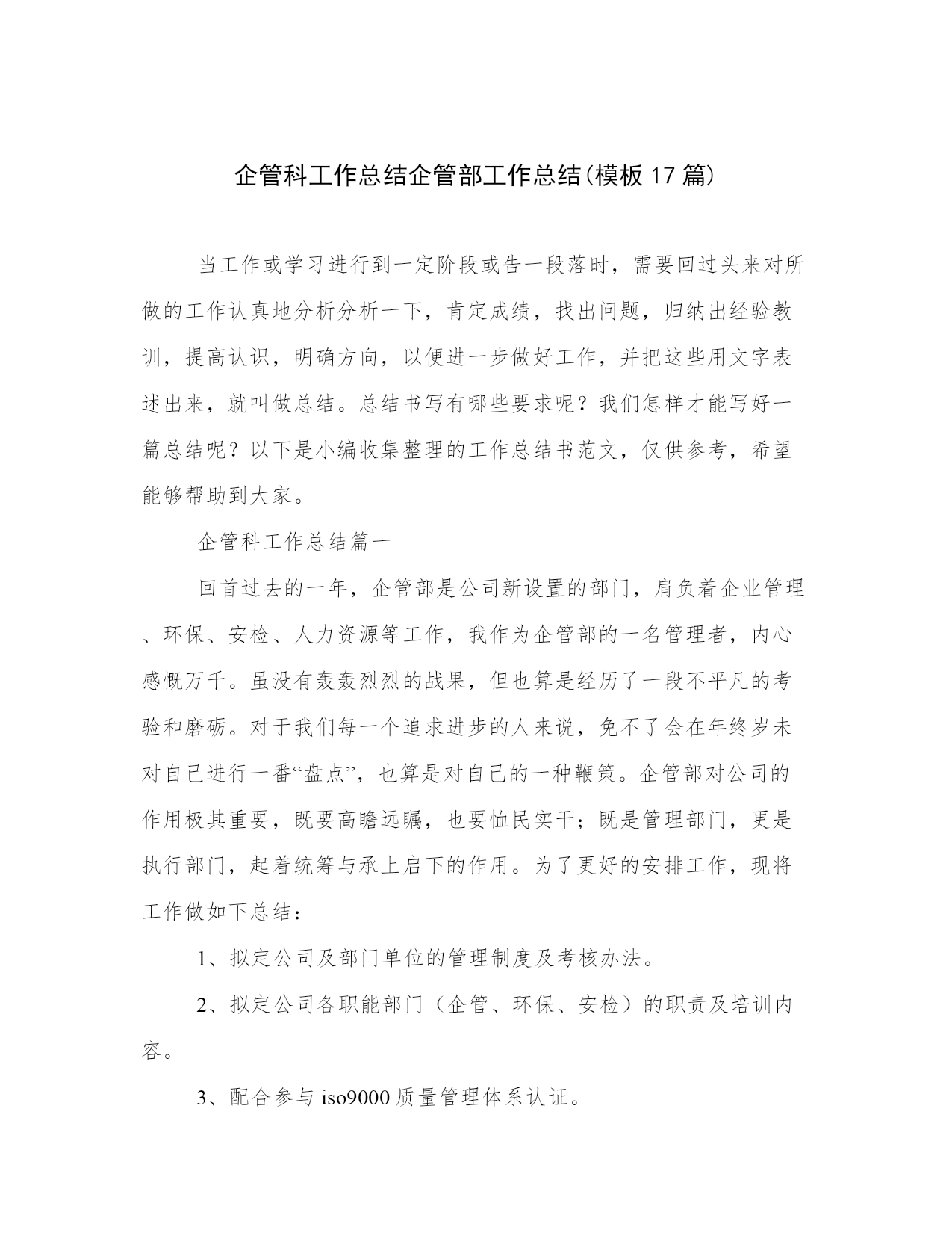 企管科工作总结企管部工作总结(模板17篇)当工作或学习进行到一定阶段或告一段落时,需要回过头来对所做的工作认真地分析分析一下,肯定成绩,找出问题,归纳出经验教训,提高认识,明确方向,以便进一步做好工作,并把这些用文字表述出来,就叫做总结。总结书写有哪些要求呢?我们怎样才能写好一篇总结呢?以下是小编收集整理的工作总结书范文,仅供参考,希望能够帮助到大家。企管科工作总结篇一回首过去的一年,企管部是公司新设置的部门,肩负着企业管理、环保、安检、人力资源等工作,我作为企管部的一名管理者,内心感慨万千。虽没有轰轰烈