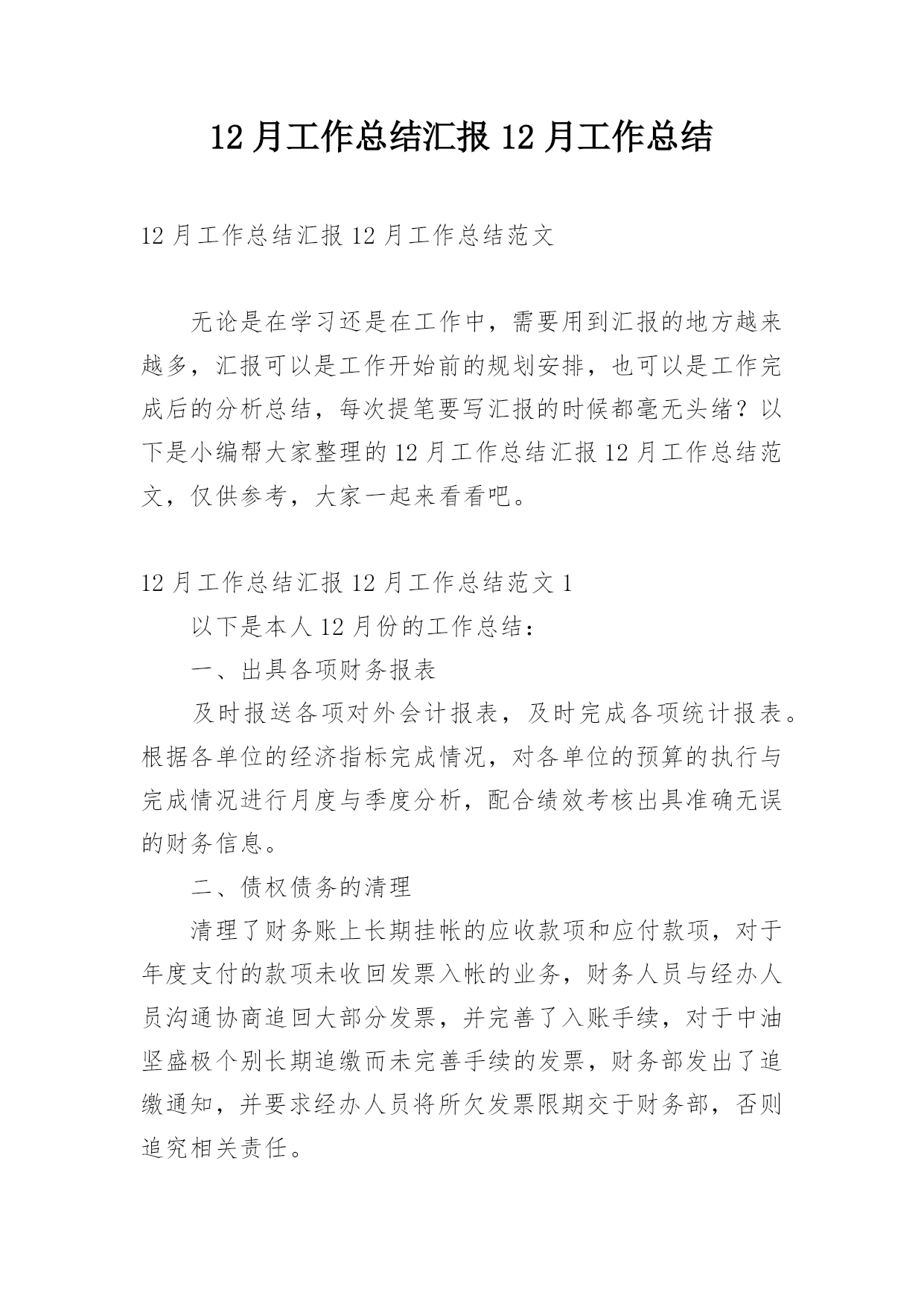 12月工作总结汇报12月工作总结12月工作总结汇报12月工作总结范文无论是在学习还是在工作中,需要用到汇报的地方越来越多,汇报可以是工作开始前的规划安排,也可以是工作完成后的分析总结,每次提笔要写汇报的时候都毫无头绪?以下是小编帮大家整理的12月工作总结汇报12月工作总结范文,仅供参考,大家一起来看看吧。12月工作总结汇报12月工作总结范文1以下是本人12月份的工作总结:一、出具各项财务报表及时报送各项对外会计报表,及时完成各项统计报表。根据各单位的经济指标完成情况,对各单位的预算的执行与完成情况进行月度