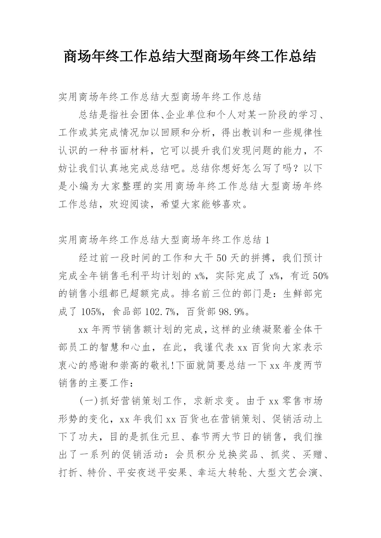 商场年终工作总结大型商场年终工作总结实用商场年终工作总结大型商场年终工作总结总结是指社会团体、企业单位和个人对某一阶段的学习、工作或其完成情况加以回顾和分析,得出教训和一些规律性认识的一种书面材料,它可以提升我们发现问题的能力,不妨让我们认真地完成总结吧。总结你想好怎么写了吗?以下是小编为大家整理的实用商场年终工作总结大型商场年终工作总结,欢迎阅读,希望大家能够喜欢。实用商场年终工作总结大型商场年终工作总结1经过前一段时间的工作和大干50天的拼搏,我们预计完成全年销售毛利平均计划的x%,实际完成了x%,有