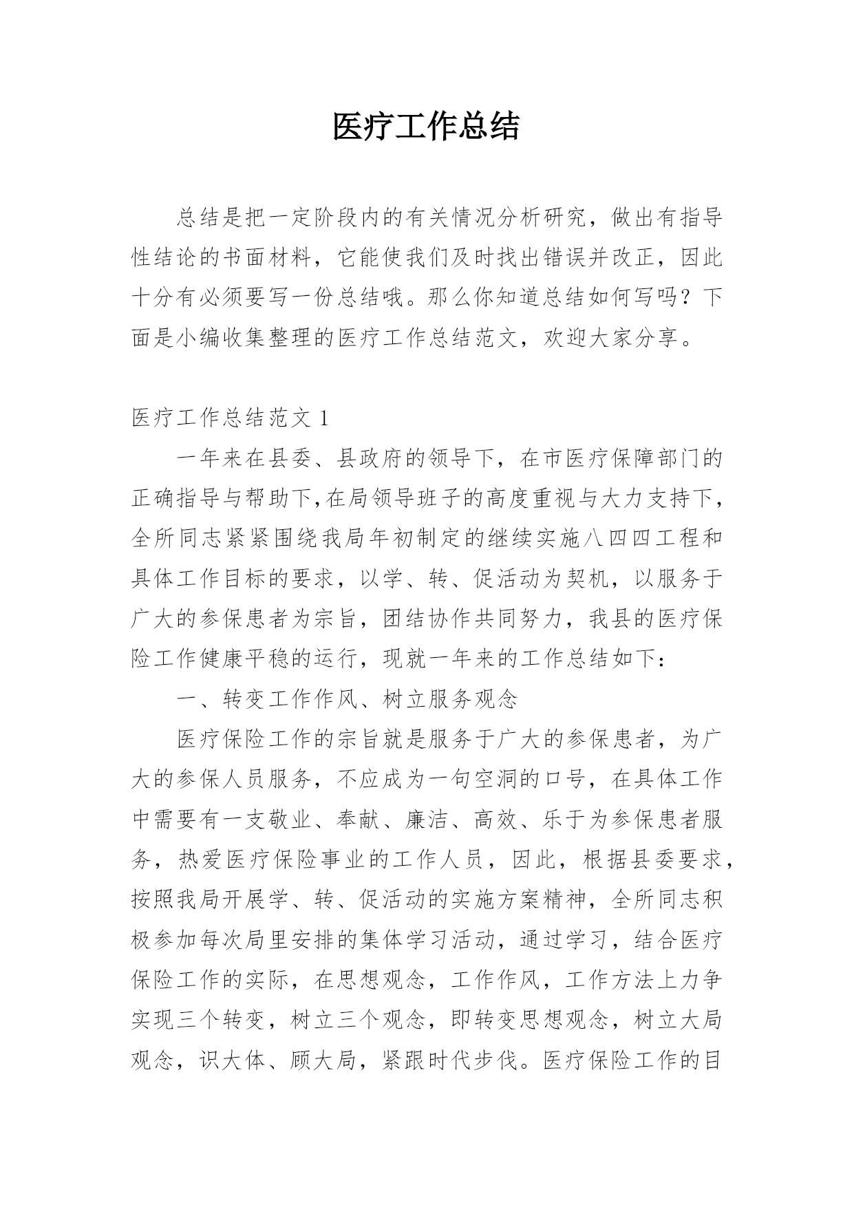 医疗工作总结总结是把一定阶段内的有关情况分析研究,做出有指导性结论的书面材料,它能使我们及时找出错误并改正,因此十分有必须要写一份总结哦。那么你知道总结如何写吗?下面是小编收集整理的医疗工作总结范文,欢迎大家分享。医疗工作总结范文1一年来在县委、县政府的领导下,在市医疗保障部门的正确指导与帮助下,在局领导班子的高度重视与大力支持下,全所同志紧紧围绕我局年初制定的继续实施八四四工程和具体工作目标的要求,以学、转、促活动为契机,以服务于广大的参保患者为宗旨,团结协作共同努力,我县的医疗保险工作健康平稳的运行,