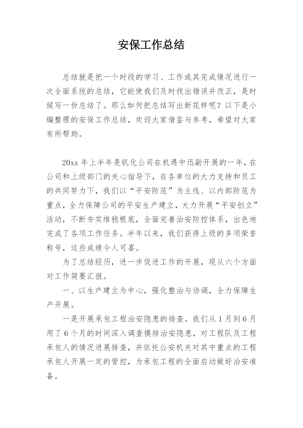 安保工作总结总结就是把一个时段的学习、工作或其完成情况进行一次全面系统的总结,它能使我们及时找出错误并改正,是时候写一份总结了。那么如何把总结写出新花样呢?以下是小编整理的安保工作总结,欢迎大家借鉴与参考,希望对大家有所帮助。20xx年上半年是钒化公司在机遇中迅勐开展的一年,在公司和上级部门的关心指导下,在各单位的大力支持和员工的共同努力下,我们以“平安防范”为主线、以内部防范为重点,全力保障公司的平安生产建立,大力开展“平安创立”活动,不断夯实维稳根底,全面完善治安防控体系,出色地完成了各项工作任务。半