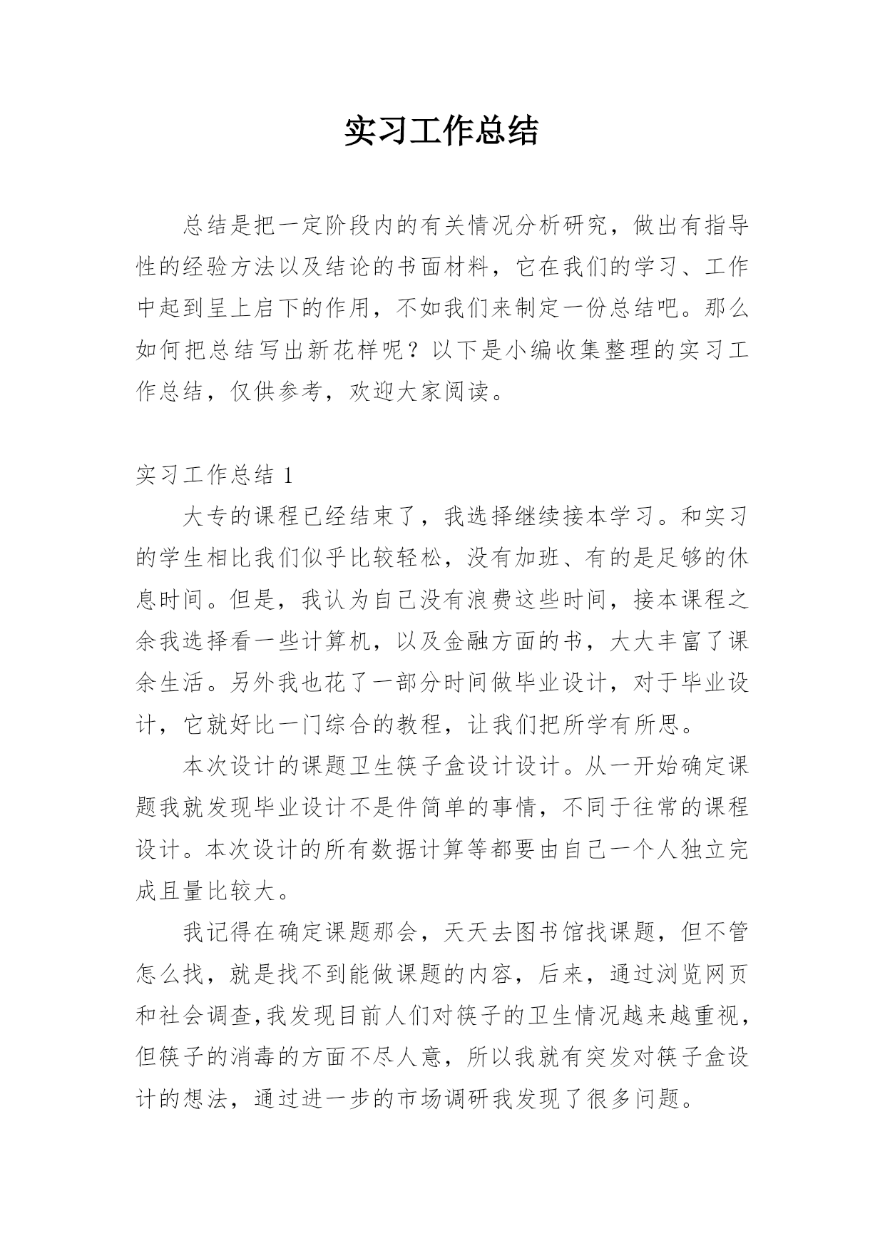 实习工作总结总结是把一定阶段内的有关情况分析研究,做出有指导性的经验方法以及结论的书面材料,它在我们的学习、工作中起到呈上启下的作用,不如我们来制定一份总结吧。那么如何把总结写出新花样呢?以下是小编收集整理的实习工作总结,仅供参考,欢迎大家阅读。实习工作总结1大专的课程已经结束了,我选择继续接本学习。和实习的学生相比我们似乎比较轻松,没有加班、有的是足够的休息时间。但是,我认为自己没有浪费这些时间,接本课程之余我选择看一些计算机,以及金融方面的书,大大丰富了课余生活。另外我也花了一部分时间做毕业设计,对于