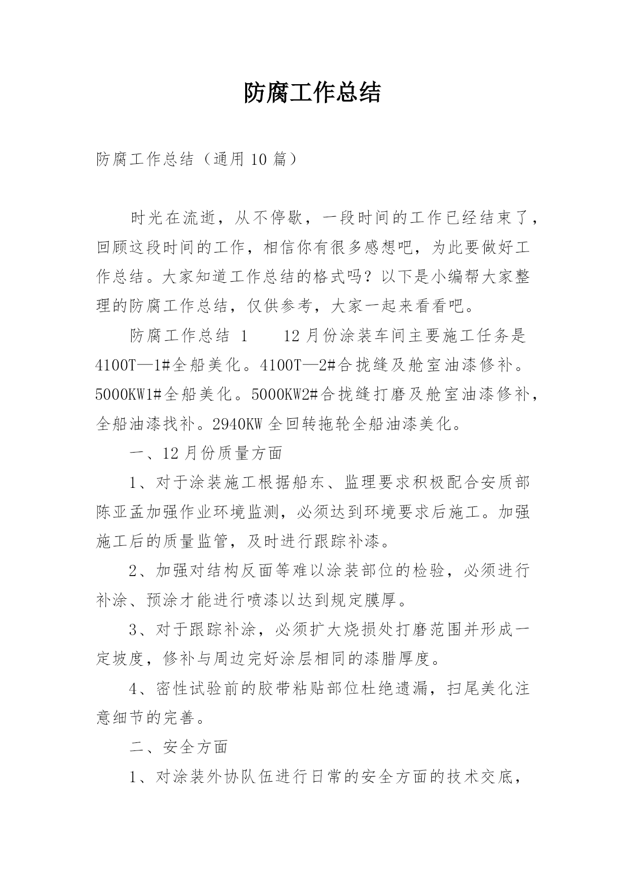 防腐工作总结防腐工作总结(通用10篇)时光在流逝,从不停歇,一段时间的工作已经结束了,回顾这段时间的工作,相信你有很多感想吧,为此要做好工作总结。大家知道工作总结的格式吗?以下是小编帮大家整理的防腐工作总结,仅供参考,大家一起来看看吧。防腐工作总结112月份涂装车间主要施工任务是4100T—1#全船美化。4100T—2#合拢缝及舱室油漆修补。5000KW1#全船美化。5000KW2#合拢缝打磨及舱室油漆修补,全船油漆找补。2940KW全回转拖轮全船油漆美化。一、12月份质量方面1、对于涂装施工根据船东、监