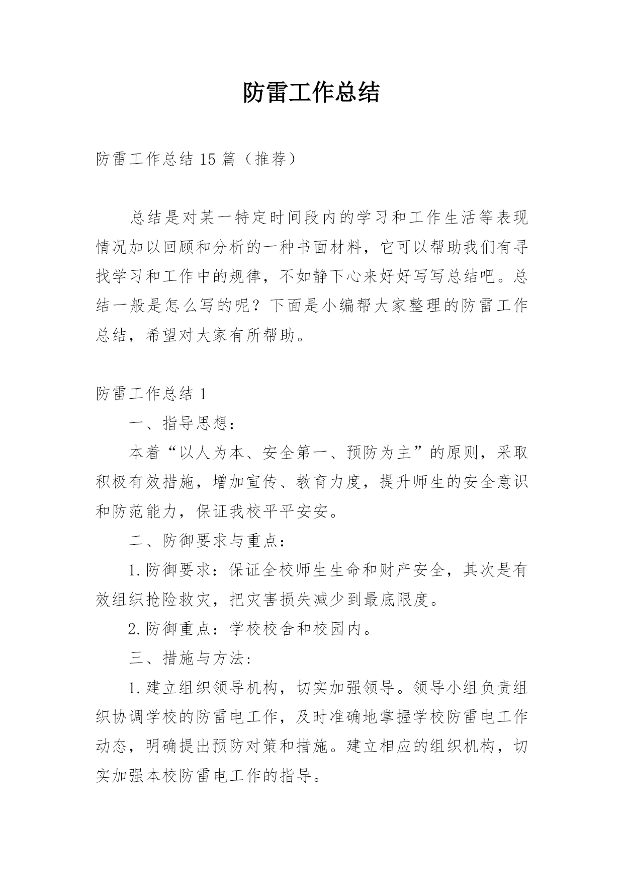 防雷工作总结防雷工作总结15篇(推荐)总结是对某一特定时间段内的学习和工作生活等表现情况加以回顾和分析的一种书面材料,它可以帮助我们有寻找学习和工作中的规律,不如静下心来好好写写总结吧。总结一般是怎么写的呢?下面是小编帮大家整理的防雷工作总结,希望对大家有所帮助。防雷工作总结1一、指导思想:本着“以人为本、安全第一、预防为主”的原则,采取积极有效措施,增加宣传、教育力度,提升师生的安全意识和防范能力,保证我校平平安安。二、防御要求与重点:1.防御要求:保证全校师生生命和财产安全,其次是有效组织抢险救灾,把