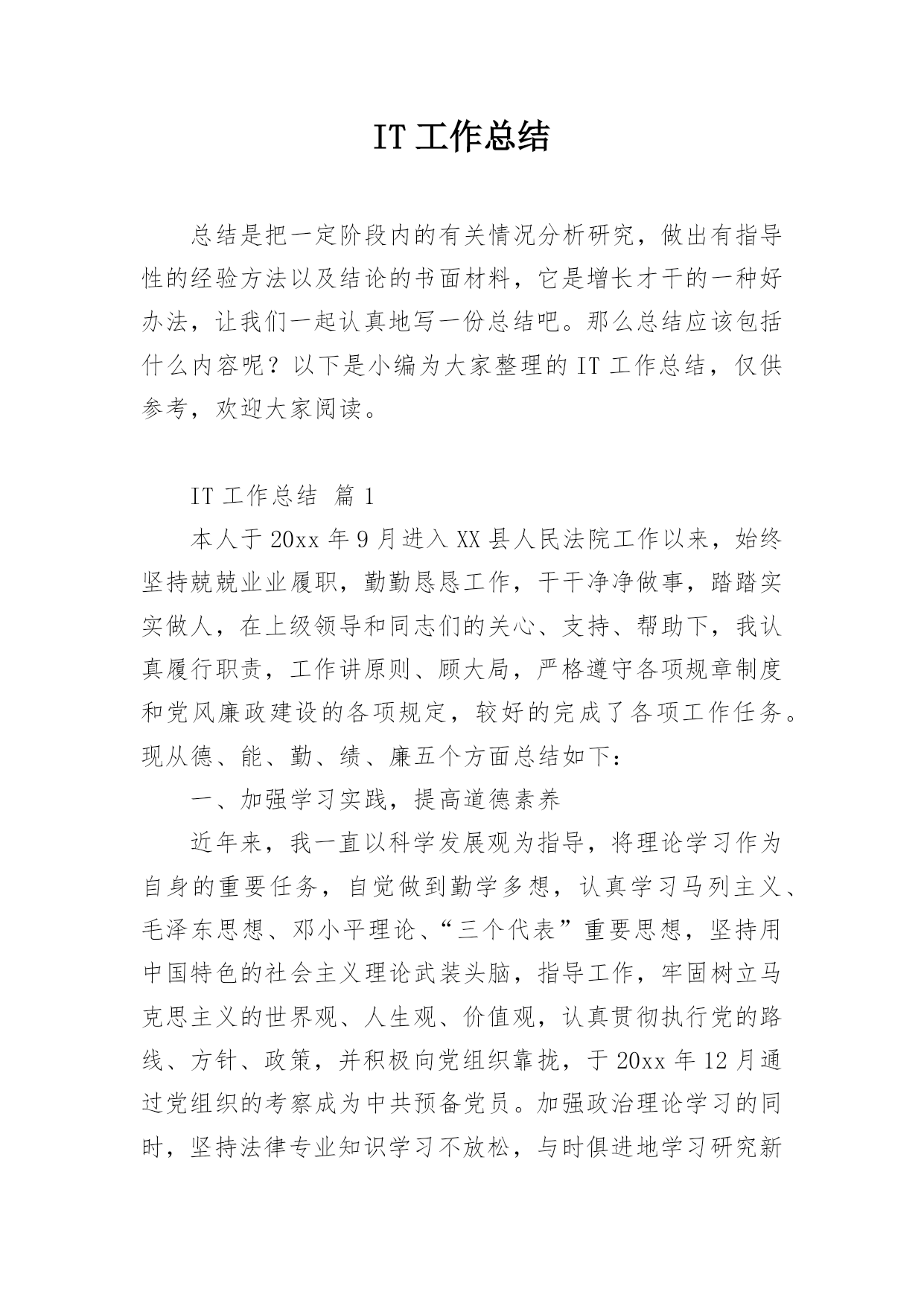 IT工作总结总结是把一定阶段内的有关情况分析研究,做出有指导性的经验方法以及结论的书面材料,它是增长才干的一种好办法,让我们一起认真地写一份总结吧。那么总结应该包括什么内容呢?以下是小编为大家整理的IT工作总结,仅供参考,欢迎大家阅读。IT工作总结篇1本人于20xx年9月进入XX县人民法院工作以来,始终坚持兢兢业业履职,勤勤恳恳工作,干干净净做事,踏踏实实做人,在上级领导和同志们的关心、支持、帮助下,我认真履行职责,工作讲原则、顾大局,严格遵守各项规章制度和党风廉政建设的各项规定,较好的完成了各项工作任务