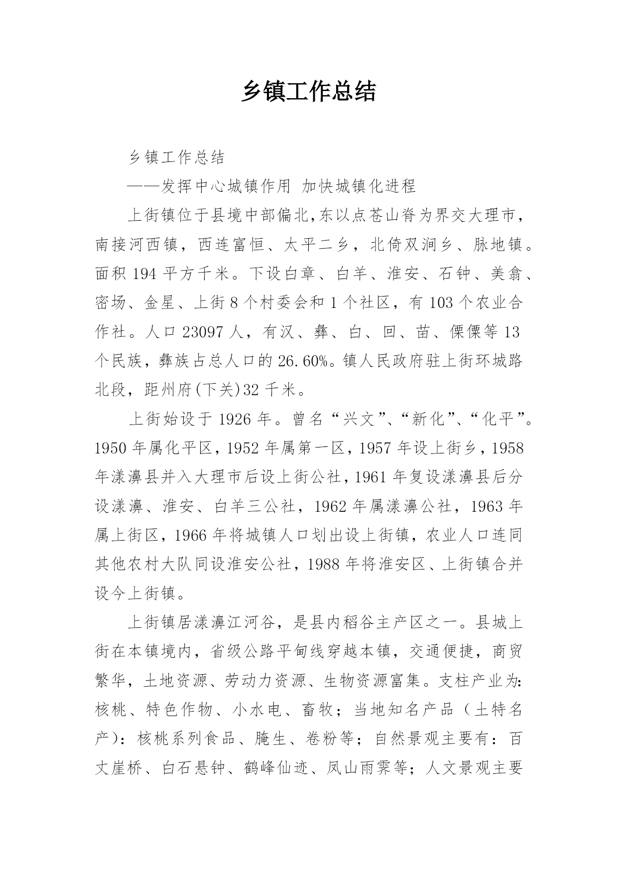 乡镇工作总结乡镇工作总结——发挥中心城镇作用加快城镇化进程上街镇位于县境中部偏北,东以点苍山脊为界交大理市,南接河西镇,西连富恒、太平二乡,北倚双涧乡、脉地镇。面积194平方千米。下设白章、白羊、淮安、石钟、美翕、密场、金星、上街8个村委会和1个社区,有103个农业合作社。人口23097人,有汉、彝、白、回、苗、傈僳等13个民族,彝族占总人口的26.60%。镇人民政府驻上街环城路北段,距州府(下关)32千米。上街始设于1926年。曾名“兴文”、“新化”、“化平”。1950年属化平区,1952年属第一区,1