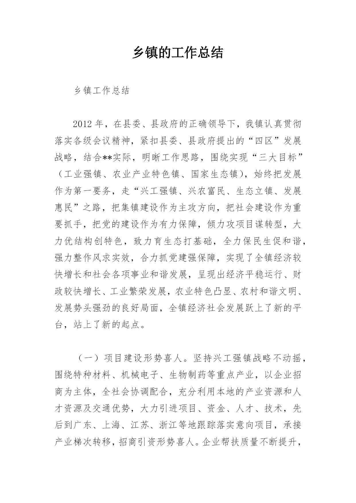 乡镇的工作总结乡镇工作总结2012年,在县委、县政府的正确领导下,我镇认真贯彻落实各级会议精神,紧扣县委、县政府提出的“四区”发展战略,结合**实际,明晰工作思路,围绕实现“三大目标”(工业强镇、农业产业特色镇、国家生态镇),始终把发展作为第一要务,走“兴工强镇、兴农富民、生态立镇、发展惠民”之路,把集镇建设作为主攻方向,把社会建设作为重要抓手,把党的建设作为有力保障,倾力攻项目谋转型,大力优结构创特色,致力育生态打基础,全力保民生促和谐,强力整作风求实效,合力抓党建强保障,实现了全镇经济较快增长和社会各
