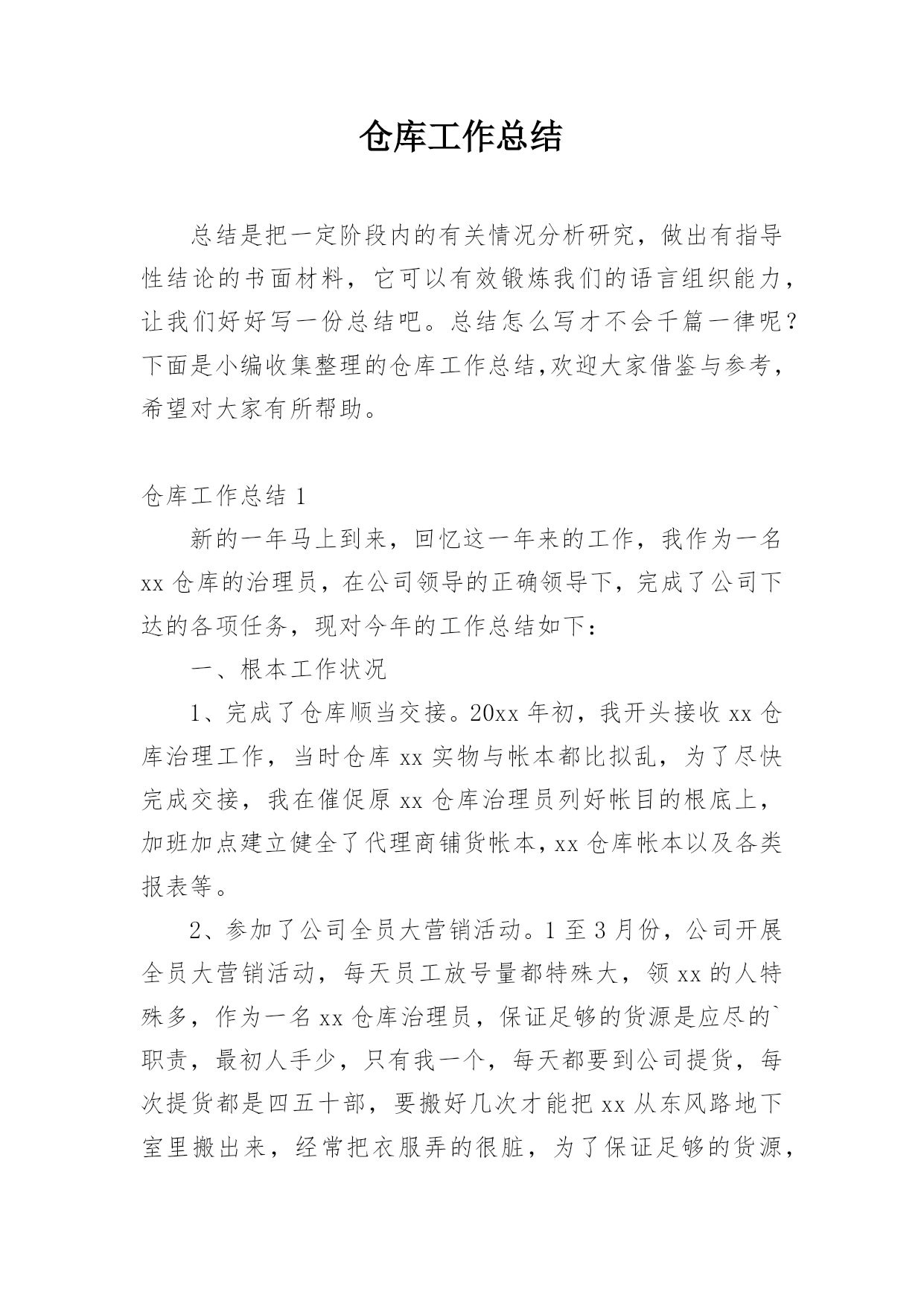 仓库工作总结总结是把一定阶段内的有关情况分析研究,做出有指导性结论的书面材料,它可以有效锻炼我们的语言组织能力,让我们好好写一份总结吧。总结怎么写才不会千篇一律呢?下面是小编收集整理的仓库工作总结,欢迎大家借鉴与参考,希望对大家有所帮助。仓库工作总结1新的一年马上到来,回忆这一年来的工作,我作为一名xx仓库的治理员,在公司领导的正确领导下,完成了公司下达的各项任务,现对今年的工作总结如下:一、根本工作状况1、完成了仓库顺当交接。20xx年初,我开头接收xx仓库治理工作,当时仓库xx实物与帐本都比拟乱,为了