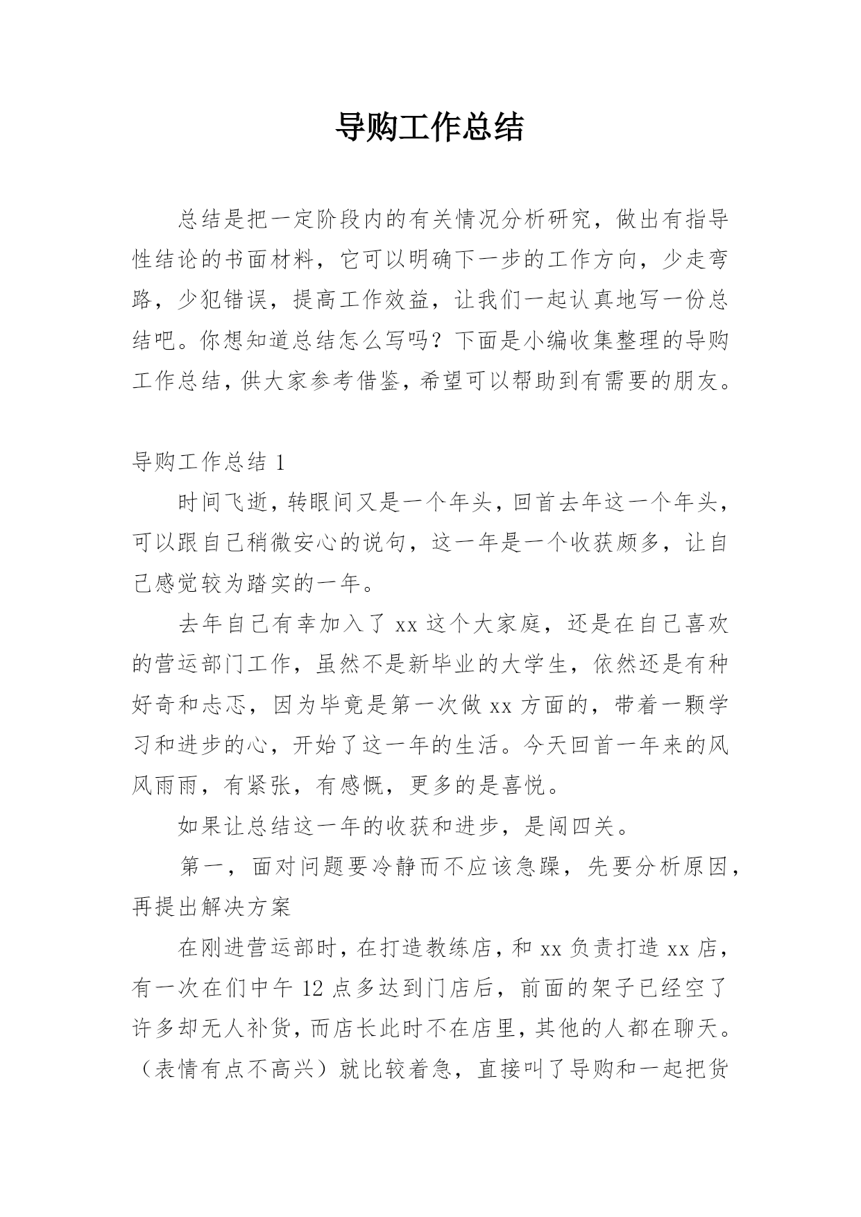 导购工作总结总结是把一定阶段内的有关情况分析研究,做出有指导性结论的书面材料,它可以明确下一步的工作方向,少走弯路,少犯错误,提高工作效益,让我们一起认真地写一份总结吧。你想知道总结怎么写吗?下面是小编收集整理的导购工作总结,供大家参考借鉴,希望可以帮助到有需要的朋友。导购工作总结1时间飞逝,转眼间又是一个年头,回首去年这一个年头,可以跟自己稍微安心的说句,这一年是一个收获颇多,让自己感觉较为踏实的一年。去年自己有幸加入了xx这个大家庭,还是在自己喜欢的营运部门工作,虽然不是新毕业的大学生,依然还是有种好