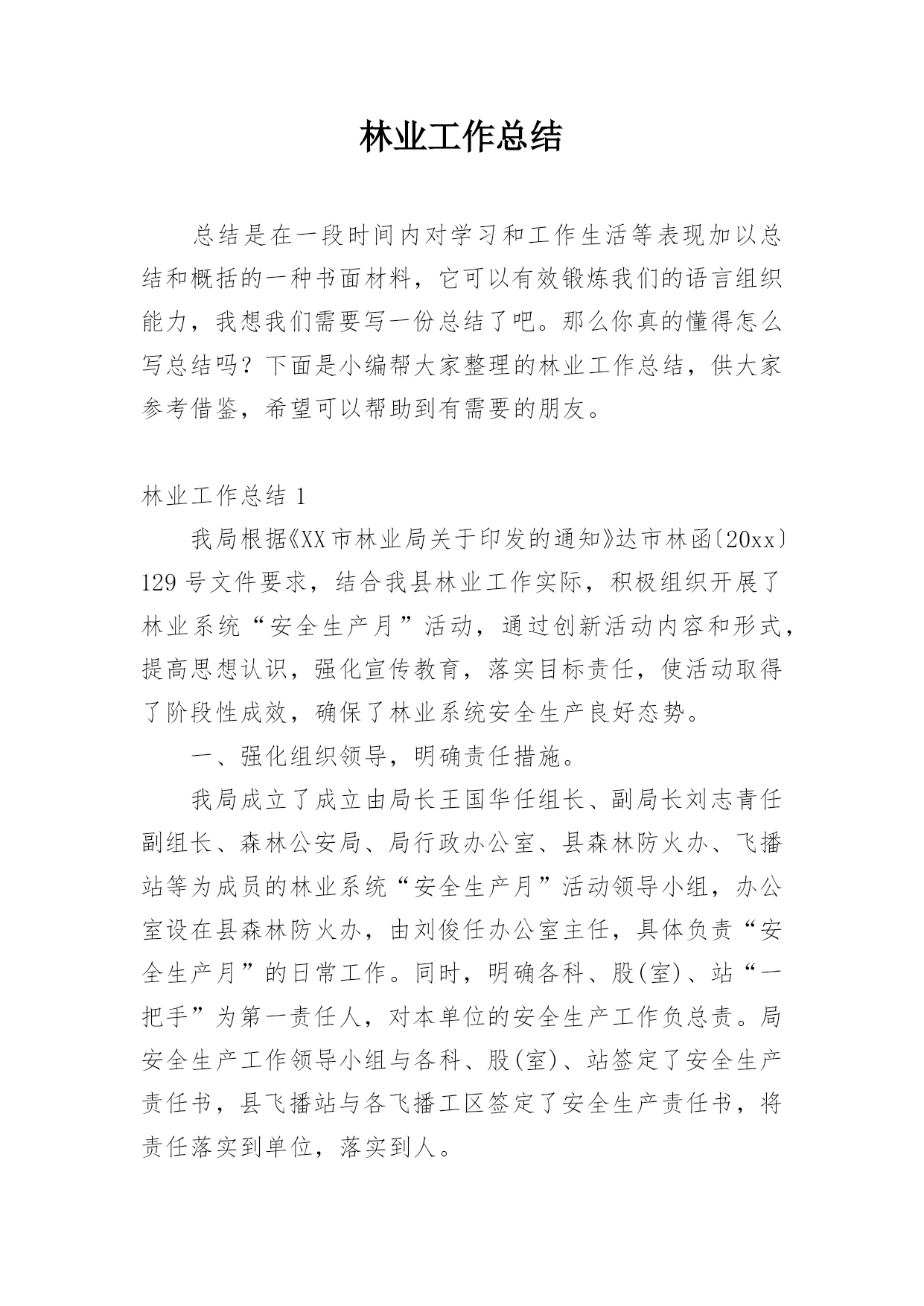 林业工作总结总结是在一段时间内对学习和工作生活等表现加以总结和概括的一种书面材料,它可以有效锻炼我们的语言组织能力,我想我们需要写一份总结了吧。那么你真的懂得怎么写总结吗?下面是小编帮大家整理的林业工作总结,供大家参考借鉴,希望可以帮助到有需要的朋友。林业工作总结1我局根据《XX市林业局关于印发的通知》达市林函〔20xx〕129号文件要求,结合我县林业工作实际,积极组织开展了林业系统“安全生产月”活动,通过创新活动内容和形式,提高思想认识,强化宣传教育,落实目标责任,使活动取得了阶段性成效,确保了林业系统