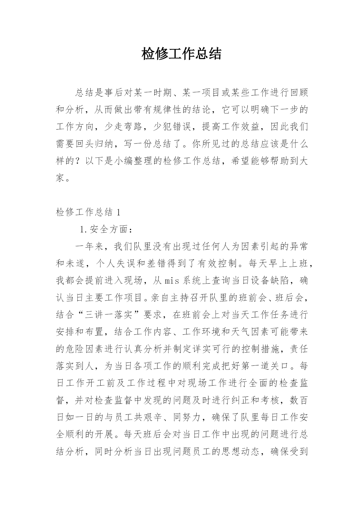 检修工作总结总结是事后对某一时期、某一项目或某些工作进行回顾和分析,从而做出带有规律性的结论,它可以明确下一步的工作方向,少走弯路,少犯错误,提高工作效益,因此我们需要回头归纳,写一份总结了。你所见过的总结应该是什么样的?以下是小编整理的检修工作总结,希望能够帮助到大家。检修工作总结11.安全方面:一年来,我们队里没有出现过任何人为因素引起的异常和未遂,个人失误和差错得到了有效控制。每天早上上班,我都会提前进入现场,从mis系统上查询当日设备缺陷,确认当日主要工作项目。亲自主持召开队里的班前会、班后会,结