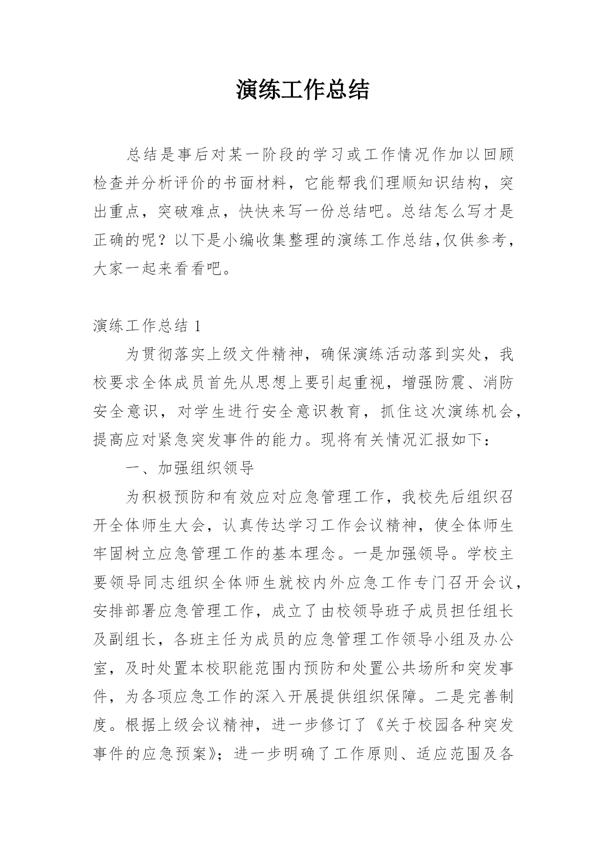 演练工作总结总结是事后对某一阶段的学习或工作情况作加以回顾检查并分析评价的书面材料,它能帮我们理顺知识结构,突出重点,突破难点,快快来写一份总结吧。总结怎么写才是正确的呢?以下是小编收集整理的演练工作总结,仅供参考,大家一起来看看吧。演练工作总结1为贯彻落实上级文件精神,确保演练活动落到实处,我校要求全体成员首先从思想上要引起重视,增强防震、消防安全意识,对学生进行安全意识教育,抓住这次演练机会,提高应对紧急突发事件的能力。现将有关情况汇报如下:一、加强组织领导为积极预防和有效应对应急管理工作,我校先后组