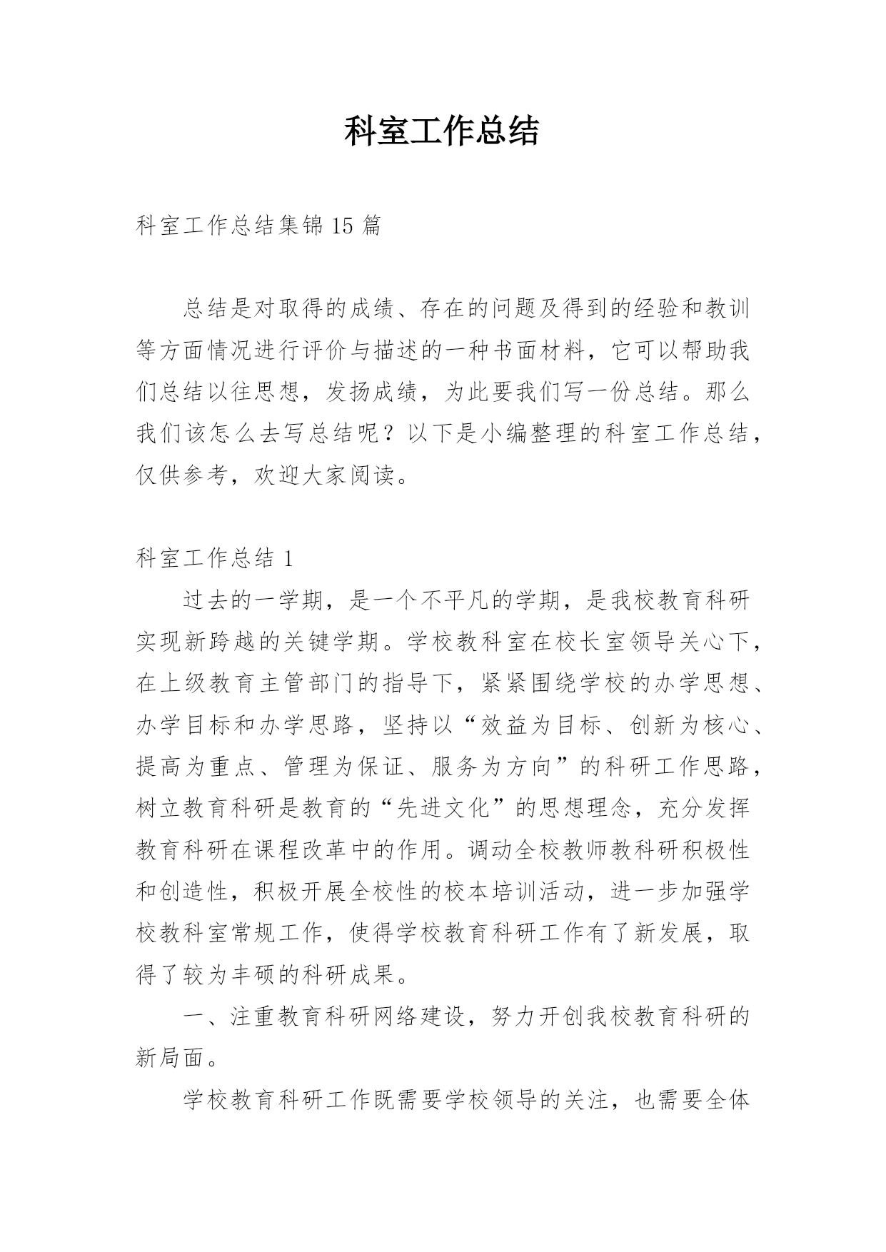 科室工作总结科室工作总结集锦15篇总结是对取得的成绩、存在的问题及得到的经验和教训等方面情况进行评价与描述的一种书面材料,它可以帮助我们总结以往思想,发扬成绩,为此要我们写一份总结。那么我们该怎么去写总结呢?以下是小编整理的科室工作总结,仅供参考,欢迎大家阅读。科室工作总结1过去的一学期,是一个不平凡的学期,是我校教育科研实现新跨越的关键学期。学校教科室在校长室领导关心下,在上级教育主管部门的指导下,紧紧围绕学校的办学思想、办学目标和办学思路,坚持以“效益为目标、创新为核心、提高为重点、管理为保证、服务为