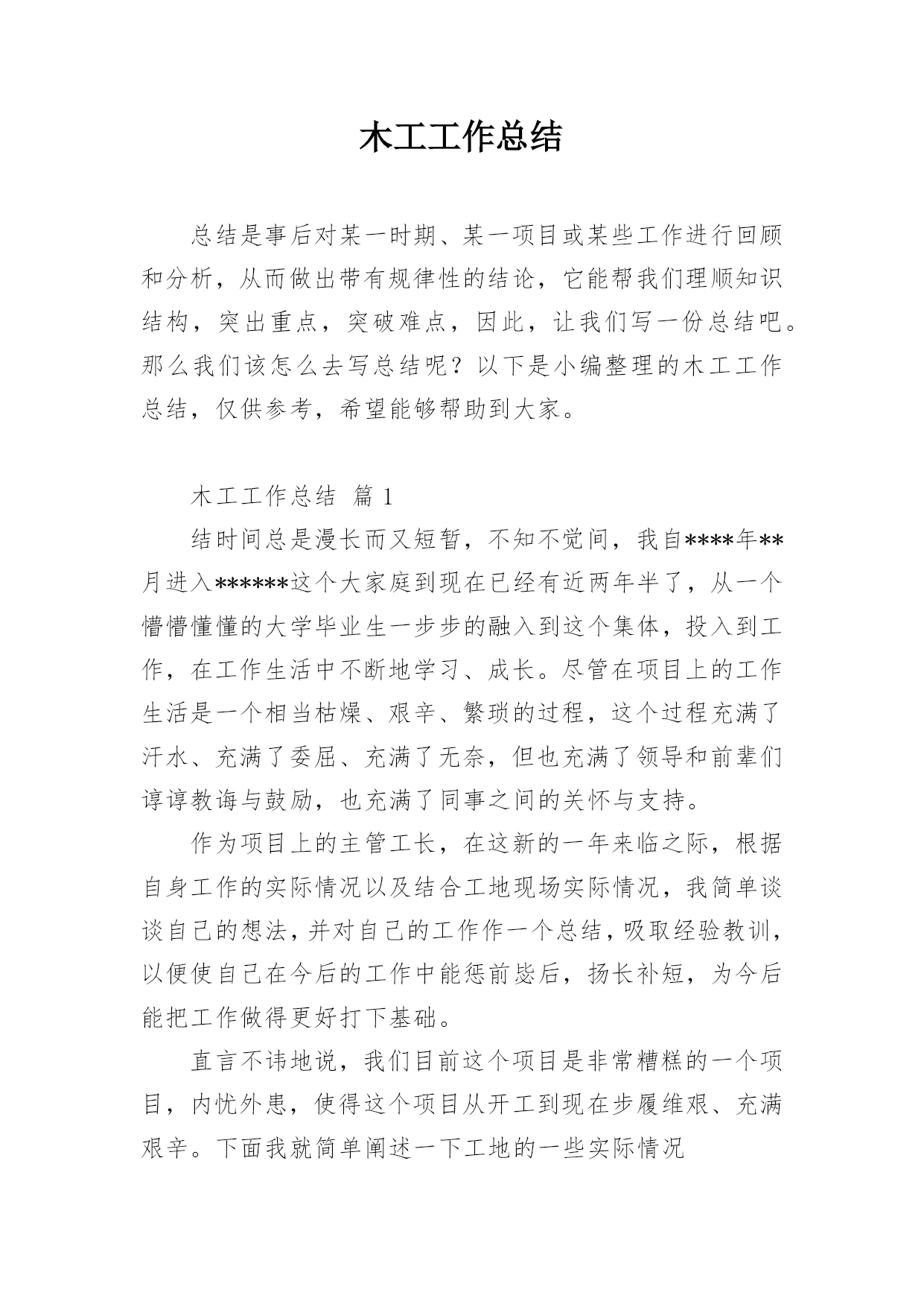 木工工作总结总结是事后对某一时期、某一项目或某些工作进行回顾和分析,从而做出带有规律性的结论,它能帮我们理顺知识结构,突出重点,突破难点,因此,让我们写一份总结吧。那么我们该怎么去写总结呢?以下是小编整理的木工工作总结,仅供参考,希望能够帮助到大家。木工工作总结篇1结时间总是漫长而又短暂,不知不觉间,我自****年**月进入******这个大家庭到现在已经有近两年半了,从一个懵懵懂懂的大学毕业生一步步的融入到这个集体,投入到工作,在工作生活中不断地学习、成长。尽管在项目上的工作生活是一个相当枯燥、艰辛、繁